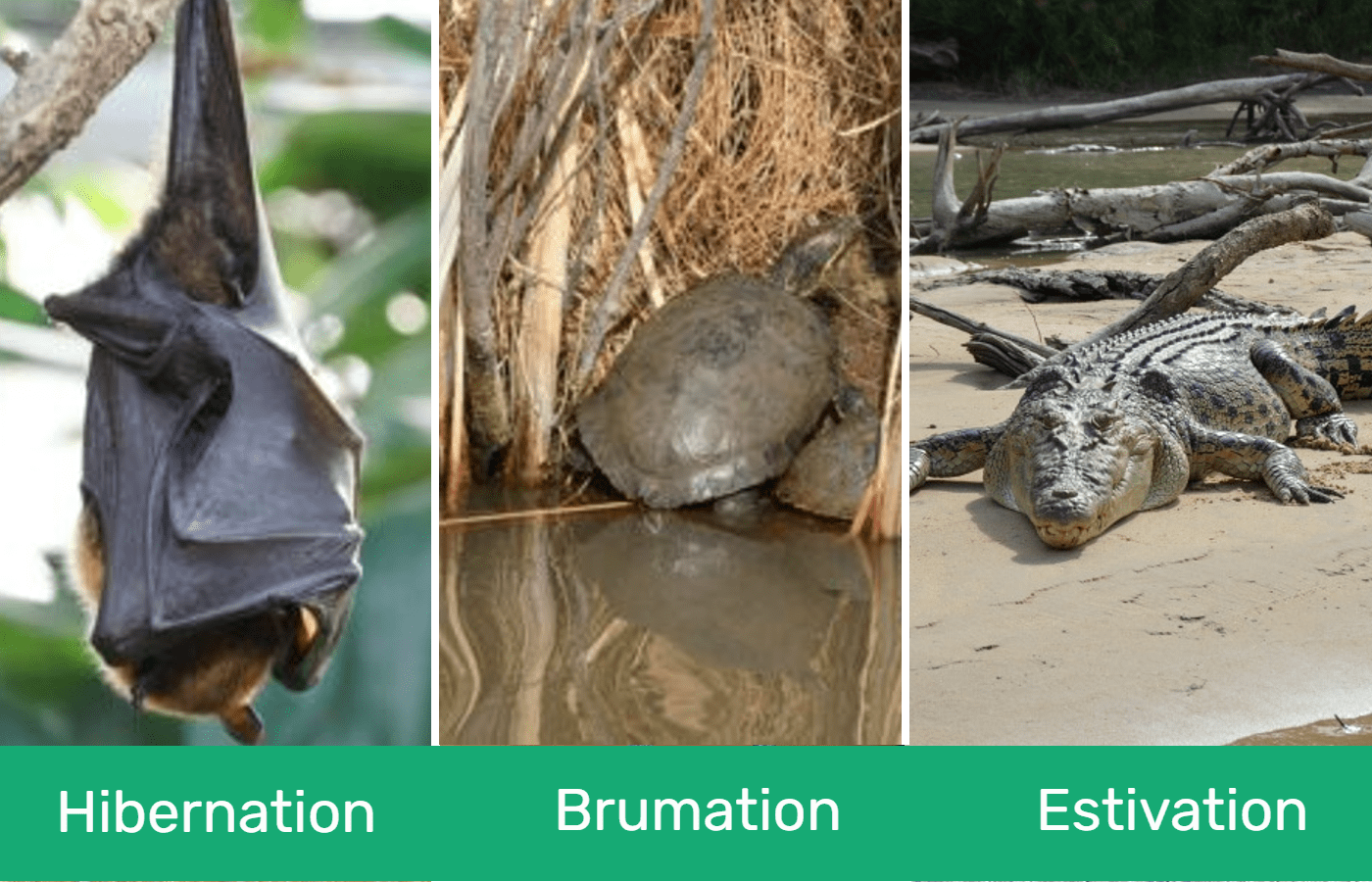 | Hibernation | Brumation | Estivation |